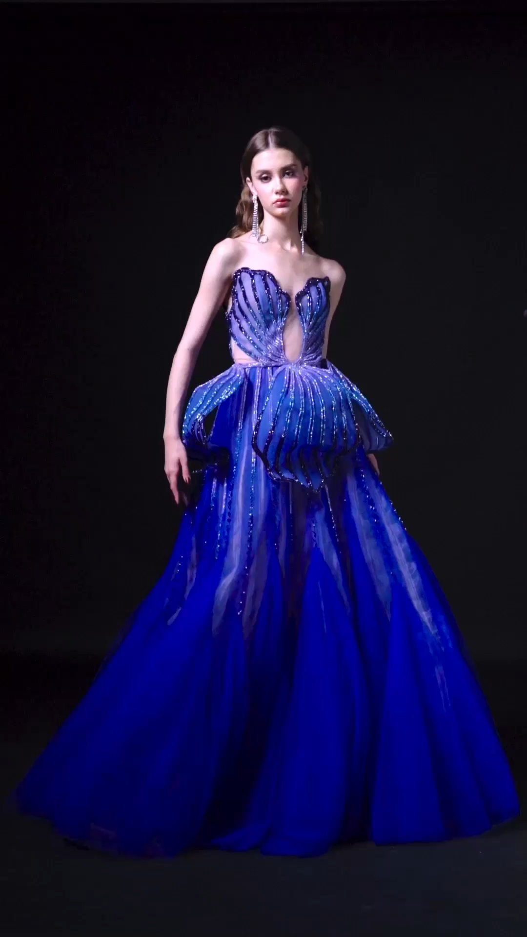 Iris germanica veining radiates in luminous colors beadworks from the core of this scultural peplum dress with illusion neckline and voluminous tulle skirt.