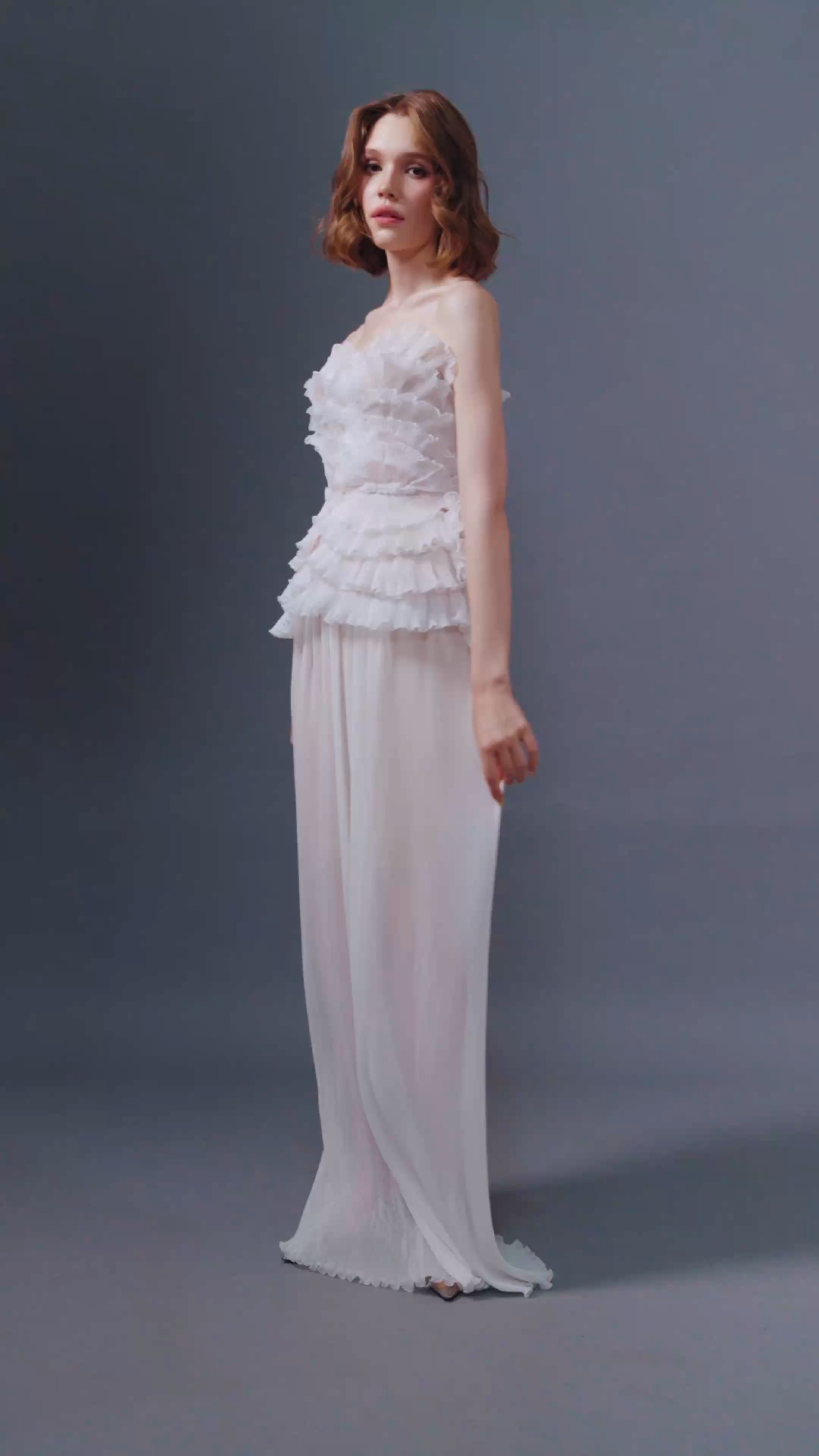 Ethereal vision in muted color maxi skirt with texture play of delicate pleats along the leg. Pair it with FRILLA TOP to bring absolute charm.