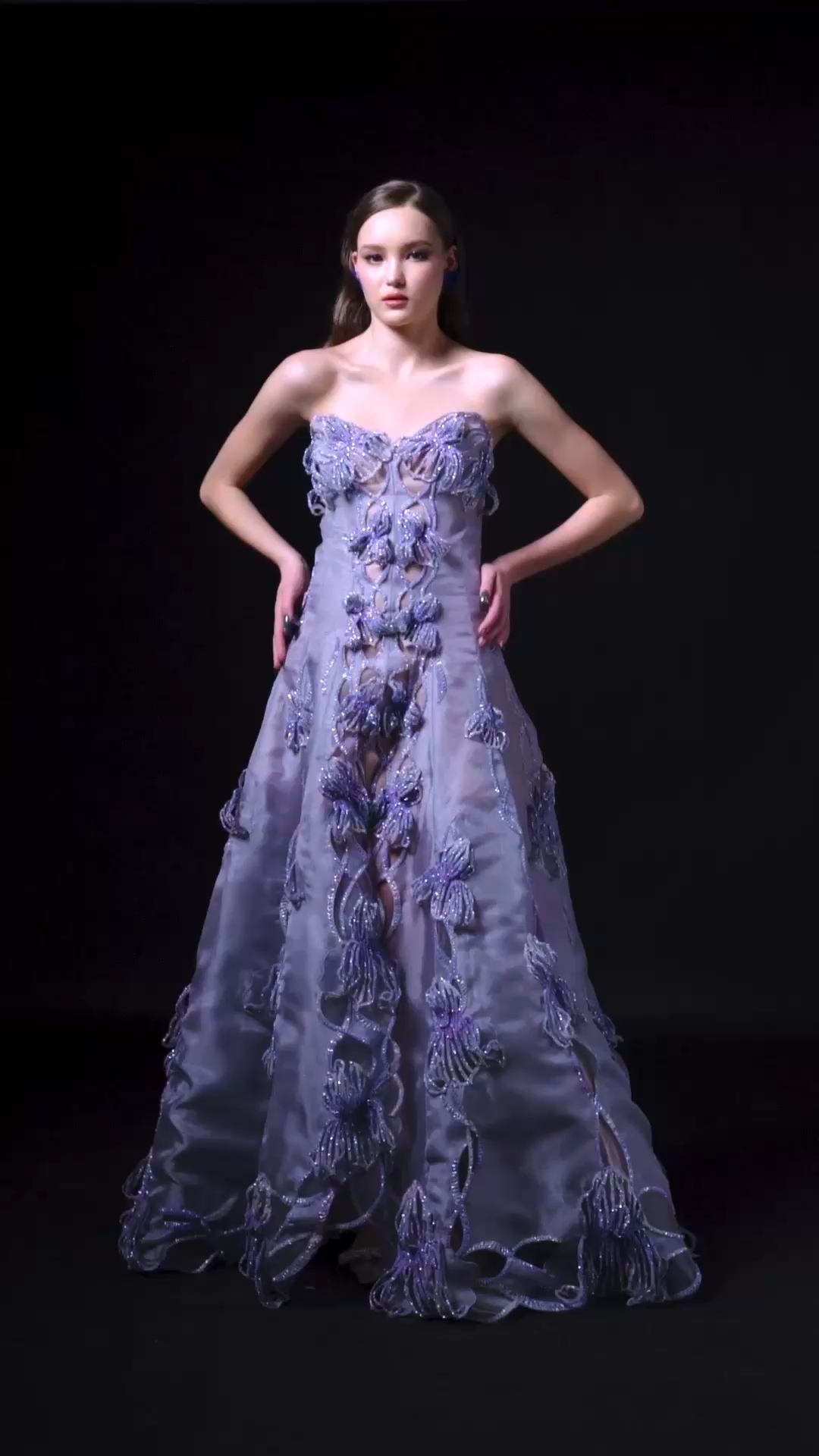 Fluorescent iris plants is glimmering in darkness on the sweetheart neckline ball gown, creeping along the full skirt hemline, glowing the night sky.