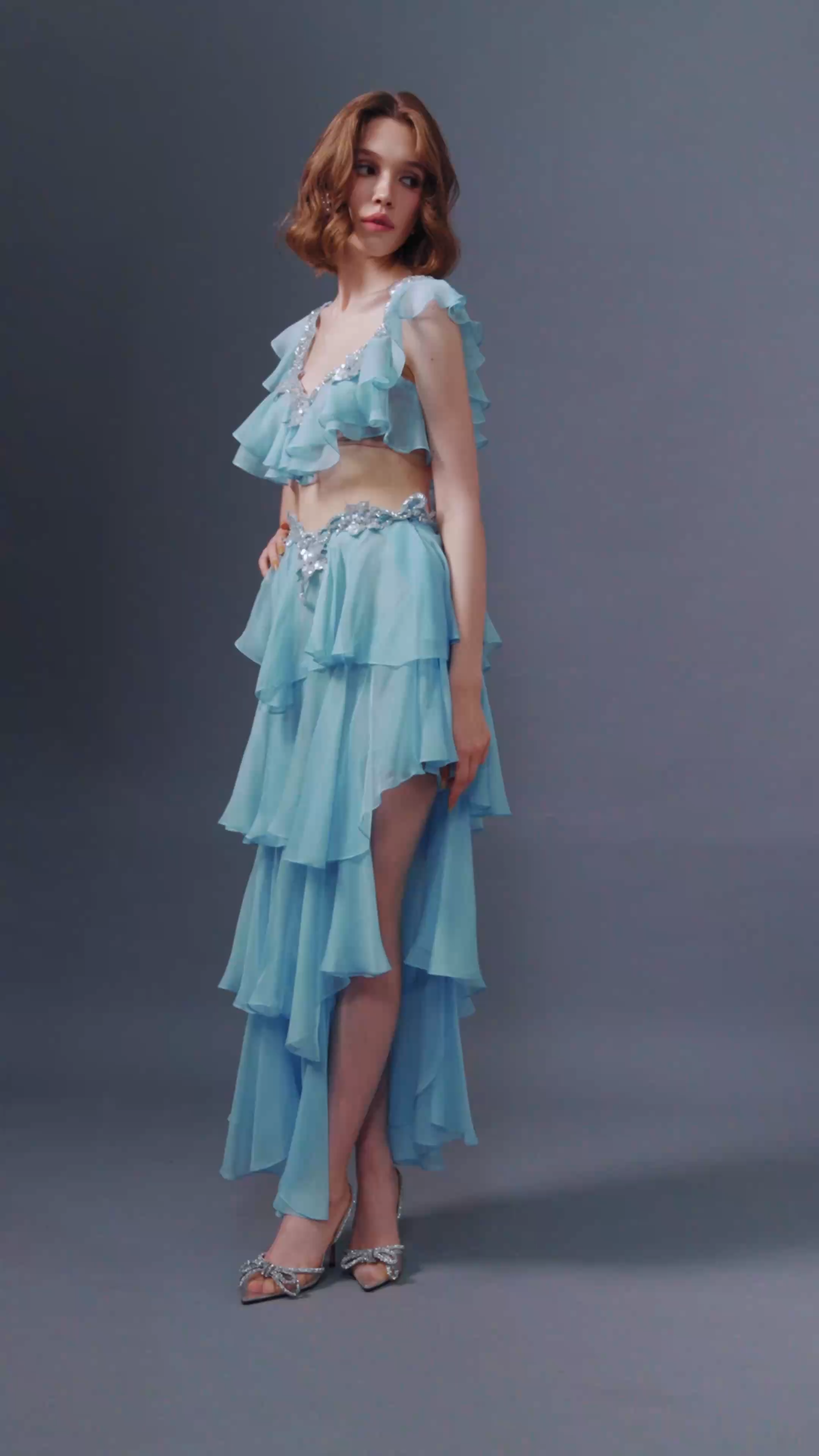 Golden sunrise casted upon the bloom resting gently on delicate chiffon set, she moves in ethereal grace.