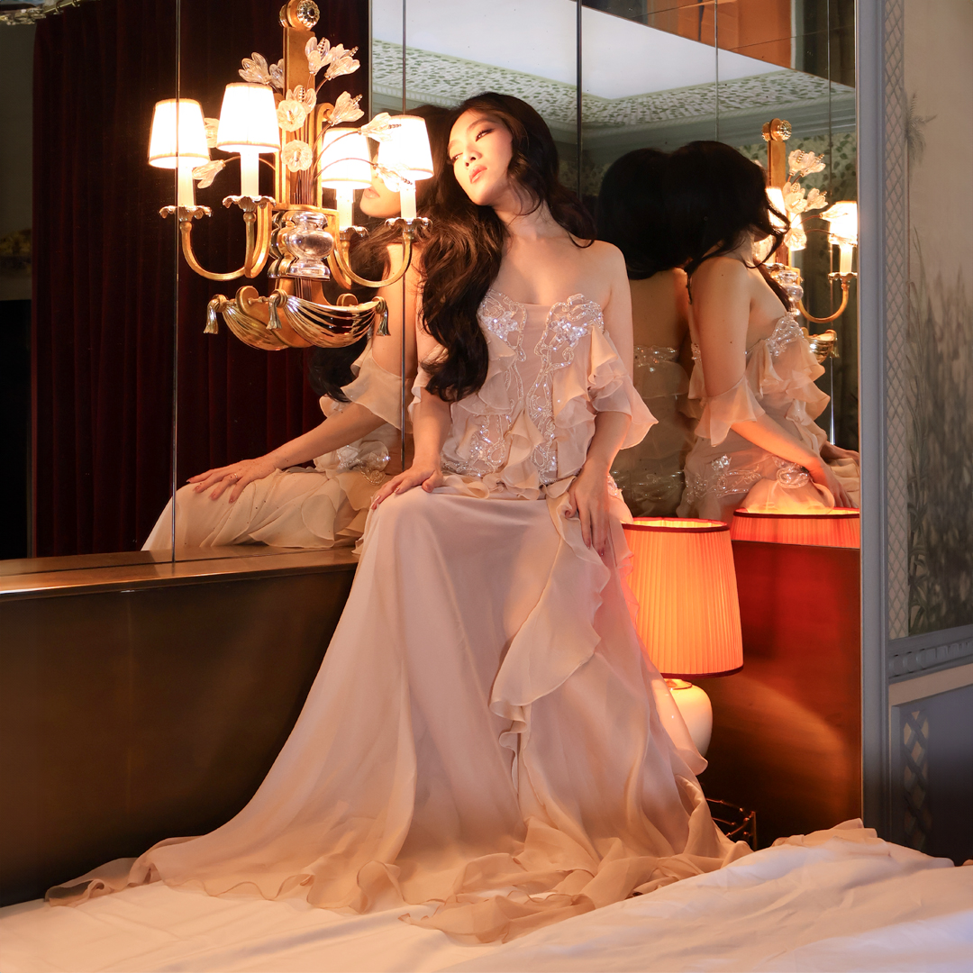 Golden sunrise casted upon the bloom resting gently on delicate chiffon dress, she moves in ethereal grace.