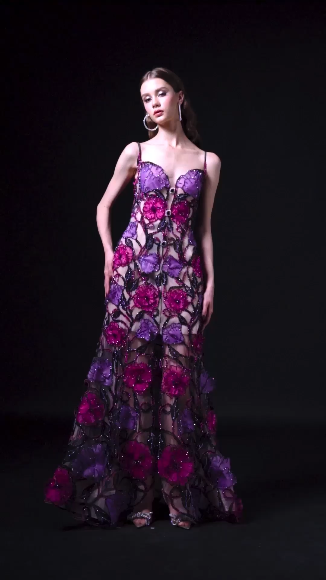 Dusk awaken the morning glory 3D petal embroidery in this balconette neckline dress, vividly imagining the fluorescent multi-colored folliage of night garden in mermaid silhouette.