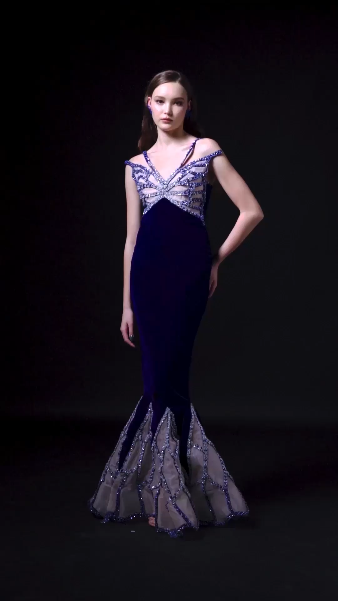 Luminous butterfly in midnight garden conceived in halter neck dress with mermaid hemline featuring luxurious velvet illuminated with 3D sequin beaded embroidery in gradiant of colors.