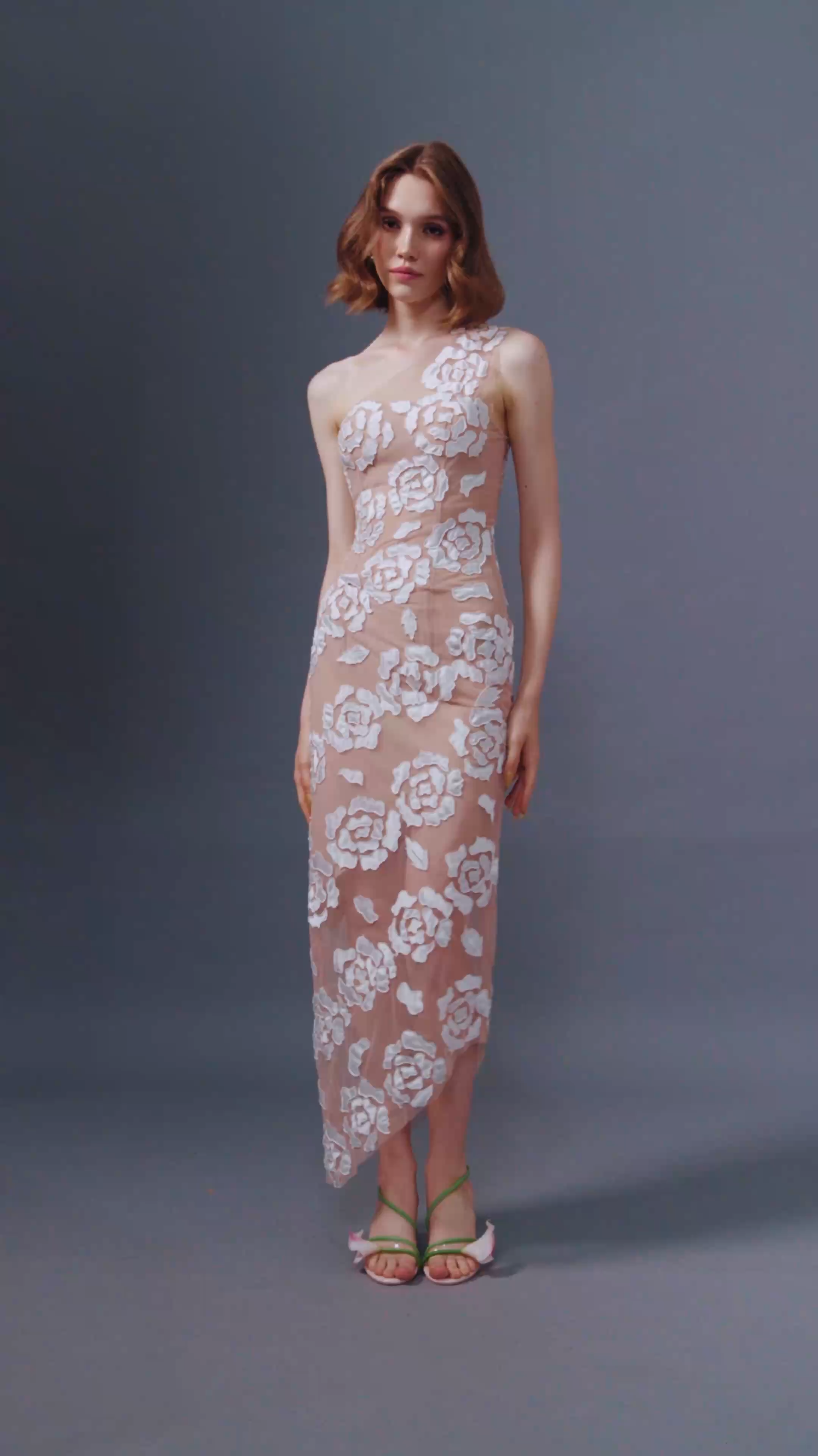A dress born from the spirit of a blooming rose, reimagined through abstract petal embroidery, radiating artistic whimsy.
