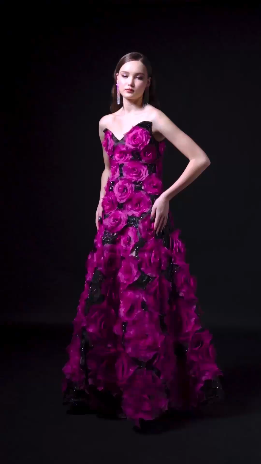 Beds of thorny roses sculpted by hand stitching, occupying this pointy V-neckline bustier dress with audacious structure and wild spirit around its full skirt ball gown.
