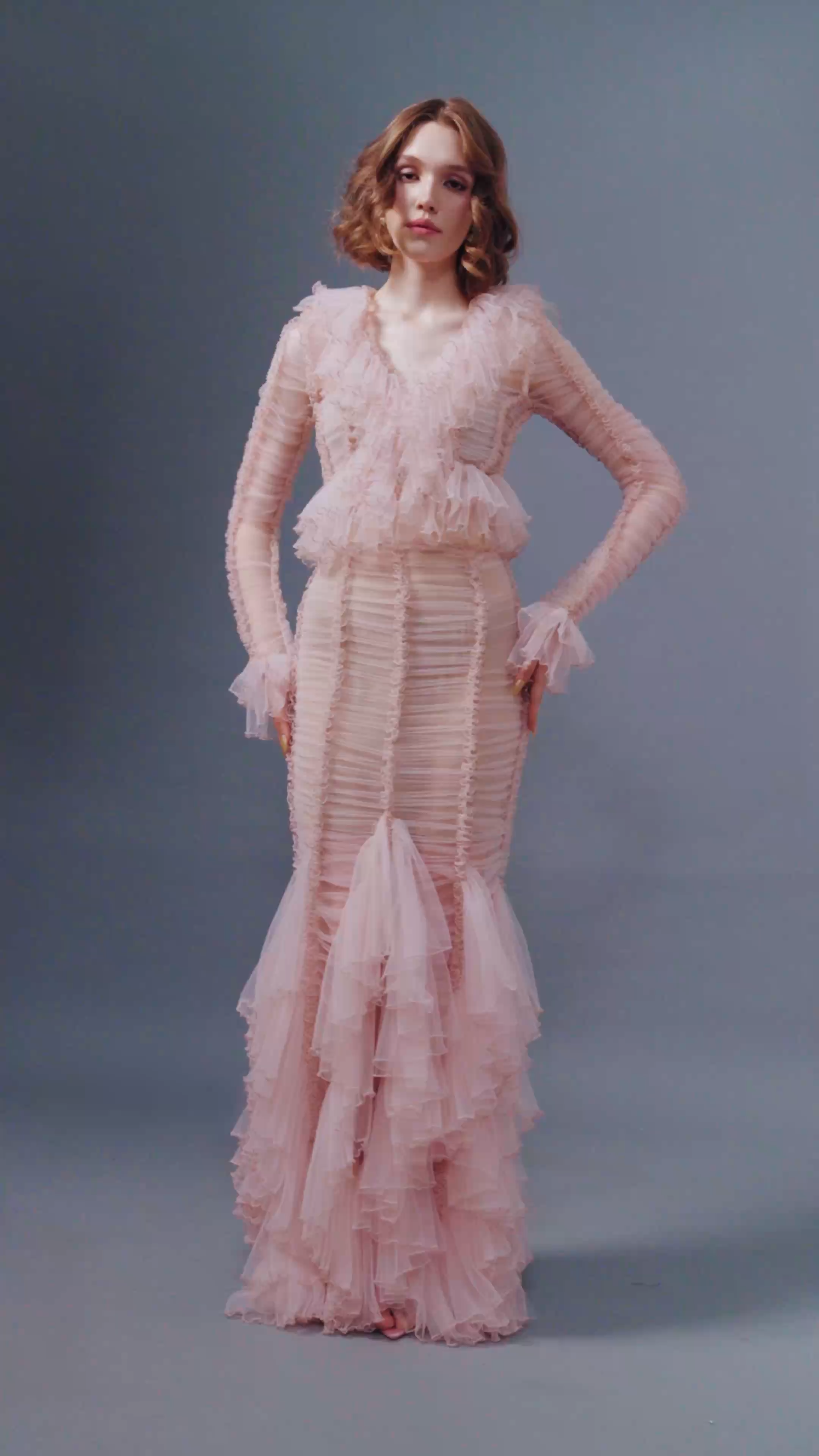 Captivating gaze of airy tulle works on the long sleeves top, casting spells of enchantment. Together with TISSA SKIRT for the look of a muse.